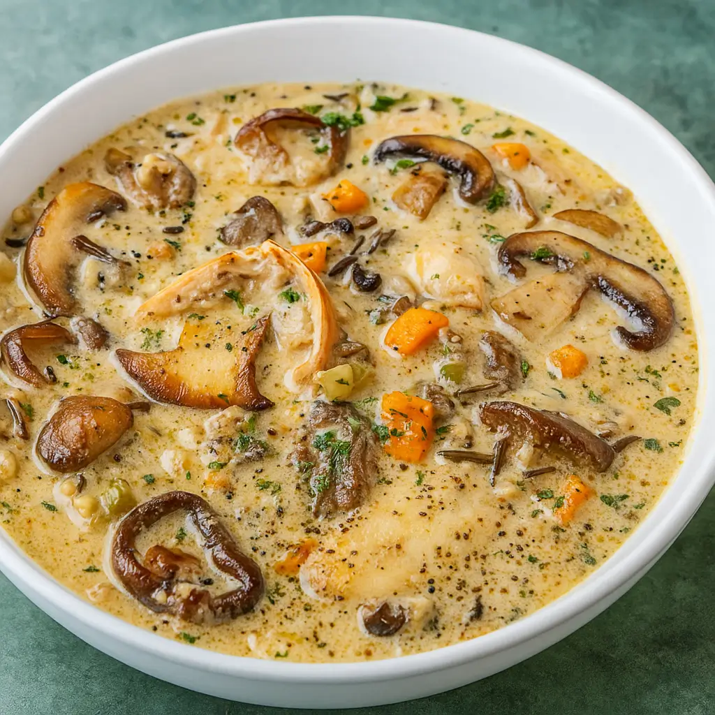 A rich and hearty soup combining tender chicken, earthy mushrooms, and nutty wild rice in a creamy, flavorful broth — perfect for chilly days.