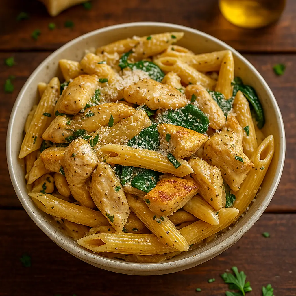 Return your cooked chicken to the skillet, juices and all. Add your cooked pasta and gently toss everything together until fully coated in that creamy garlic Parmesan sauce. If you’re adding baby spinach (which we totally recommend for a pop of color and nutrients), stir it in now. It’ll wilt quickly from the residual heat—no extra cooking needed.