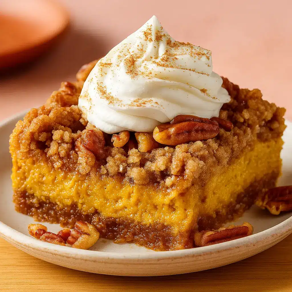 Now comes the fun part: sprinkle the crumble topping evenly over the pumpkin filling. Don’t press it down—just gently scatter it across the top so it forms a nice layer. It’ll bake into a golden-brown crust that’s rich, crisp, and perfectly nutty.
