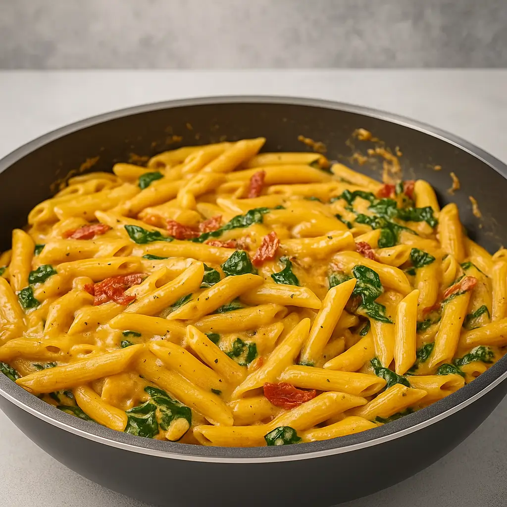 One-Pot Spinach Tomato Pasta is the kind of weeknight dinner that’s got your back when your energy is low, your kids are “starving,” and dishes are the last thing you want to deal with. It’s creamy, comforting, and comes together in one pot (yes, really)—with pantry staples like penne, sun-dried tomatoes, and heavy cream.