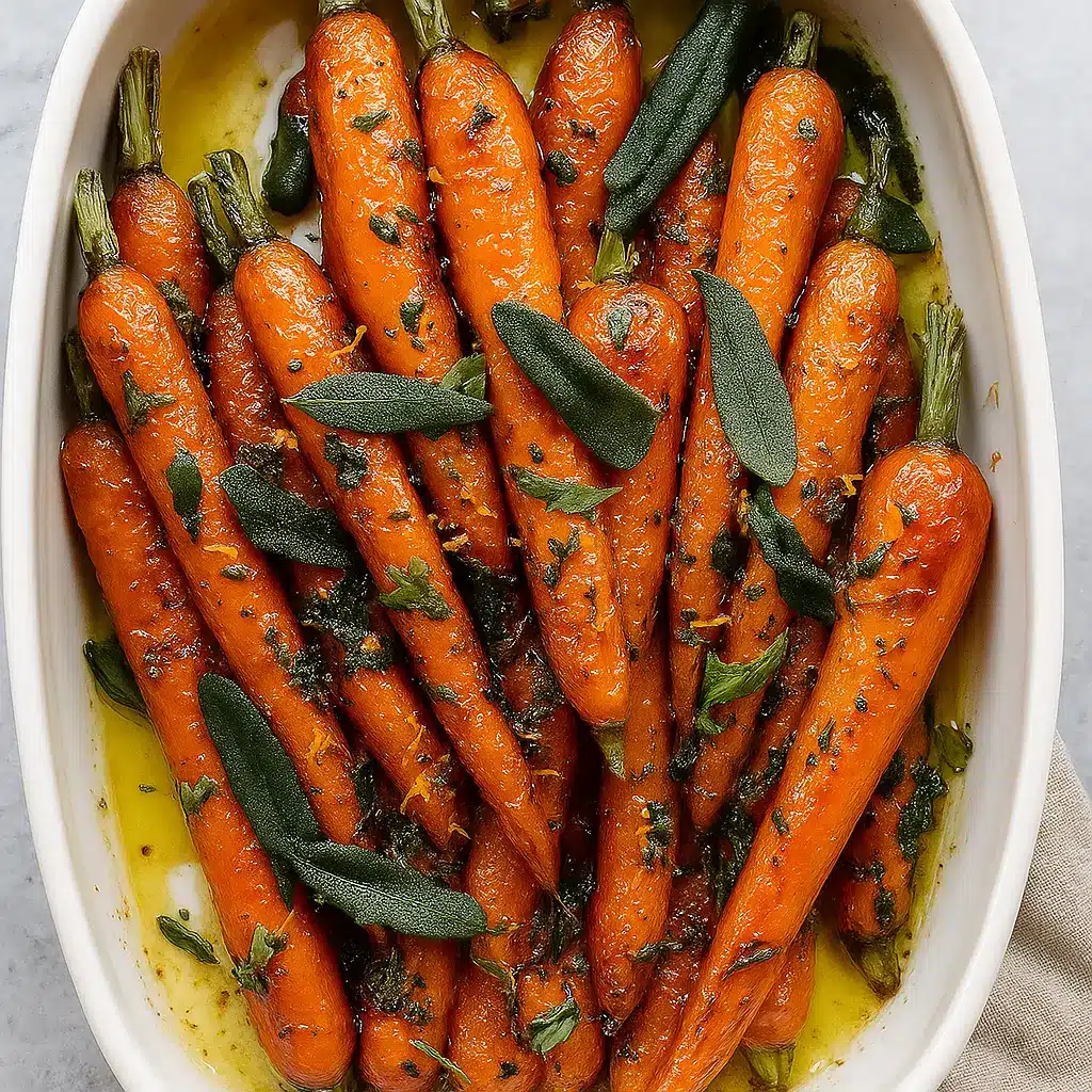 Once roasted to perfection, transfer the carrots to a serving platter. Garnish with 8 fresh sage leaves for a festive and aromatic finish. You can gently fry the sage leaves in a bit of olive oil if you want them crispy—it adds a beautiful texture contrast and a lovely herbaceous note.